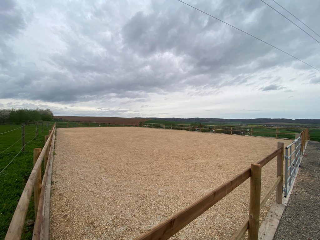 Der 2023 neu erbaute Reitplatz in Hallennähe hat einen pflegeleichten Gatterspäne Belag von „Der Grüne Sand“ und ist nahezu ganzjährig bereitbar. Außerdem ist er von einem doppelten Holzzaun umgeben.